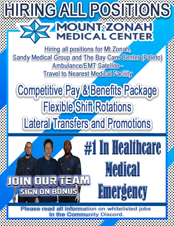 Mt.Zonah Medical Center - EMS Mt.Zonah is the primary medical group facilitator. The State Medical Director and Command operate from the facility located in Los Santos and provide the training for the medical group professionals in Paleto and Sandy Shores. Mt.Zonah has state of the art facilities, Surgery Clinic, and Long Term Recovery Center.